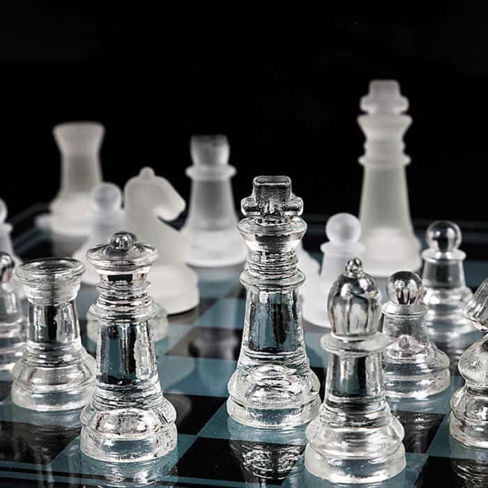 - Elegant glass chess set with solid and crystal mirror boards.